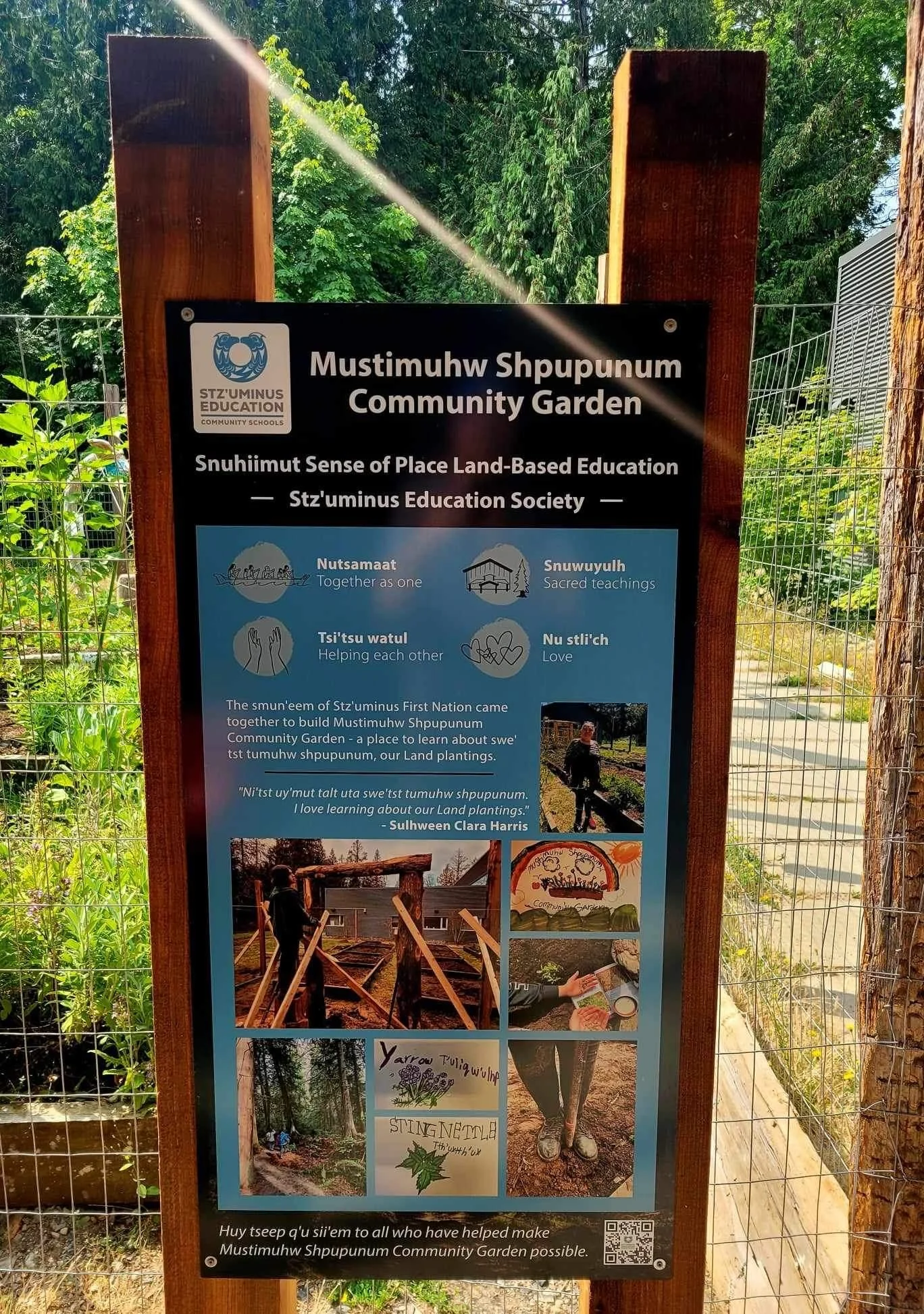 The Mustimuhw Shpupunum Community Plantings Program was a Land-based, inclusive, and experiential initiative that brought together youth, adults, and Elders to cultivate a 0.25-acre garden dedicated to traditional medicinal plants and essential food crops. This project aimed to protect cultural landscapes, strengthen connections to traditional plant knowledge, and honor Elder wisdom by engaging in the growing, harvesting, and processing of these plants and crops. Throughout 2023, the smun’eem of Stz’uminus First Nation came together to build the Mustimuhw Shpupunum Community Garden - a place to learn about swe’tst tumuhw shpupunum, our Land plantings. The smun’eem worked with Elders to explore traditional medicinal plants, germinate seedlings, create Hul’q’umi’num’ signage for their garden, build a fence with the students from the Sxwi’em’ Shelh Story Trails program, and write a book about the process. With permission, this work has been photographed and documented to inspire Land-based literacy and Place-based learning. Huy tseep q’u sii’em to all who have made this possible.